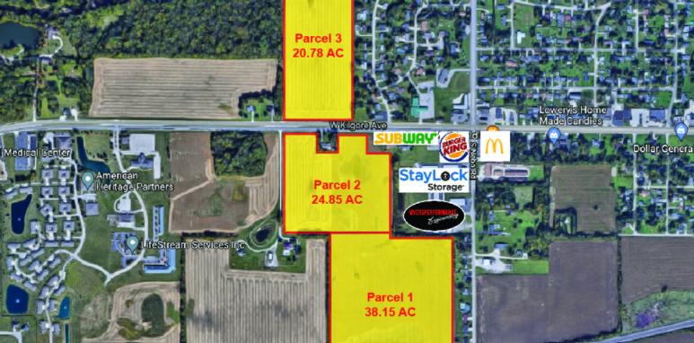 83.78 total acres, ideal for built-to-suit opportunities. Parcel 1 (38.15 acres) zoned single-family high density, Parcel 2 (24.85 acres) zoned office/commercial, Parcel 3 (20.78 acres) zoned commercial/multi-family.