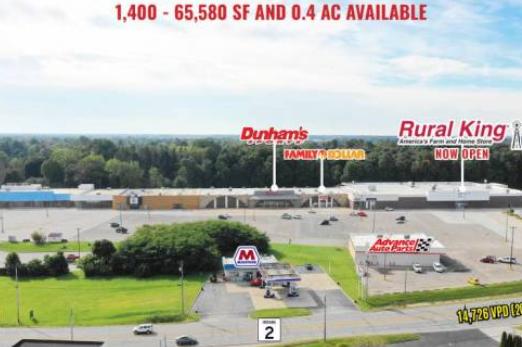 Join Rural King (now open), Dunham’s Sports, and Family DollarExterior and interior shopping center redevelopment completed 2020, including a redesigned and replaced parking lot, an improved façade, and a new pylon signSignage available on the newly constructed pylon sign at the signalized main entrance off of SR 2Population of over 70,000 within a 10-mile radiusOver 14,000 vehicles pass the site dailyAVAILABLE:Up to 65,580 SF of combinable contiguous space25,000 SF12,580 SF10,500 SF16,200 SF11,880 SF1,400 SF0.4 AC outlot