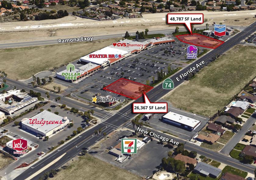 SRS Real Estate Partners is pleased to offer for sale three prime development pads (Parcel 4/5: 48,787 SF and Parcel 7: 26,367 SF) at the high-performing Mountain View Plaza retail center in Hemet, CA - one of Southern California’s fastest growing submarkets. These sites are ideal for pandemic resistant uses like fast casual or drive-thru quick service restaurants.The outparcels are located near the intersection of East Florida Avenue and Ramona Expressway, and are exposed to approx 19,000 cars per day. They offer great visibility along Florida Avenue, with 270 feet of frontage collectively. For access, there are three main entrances to the center from Florida Avenue, one off New Chicago Avenue, and one off Ramona Expressway