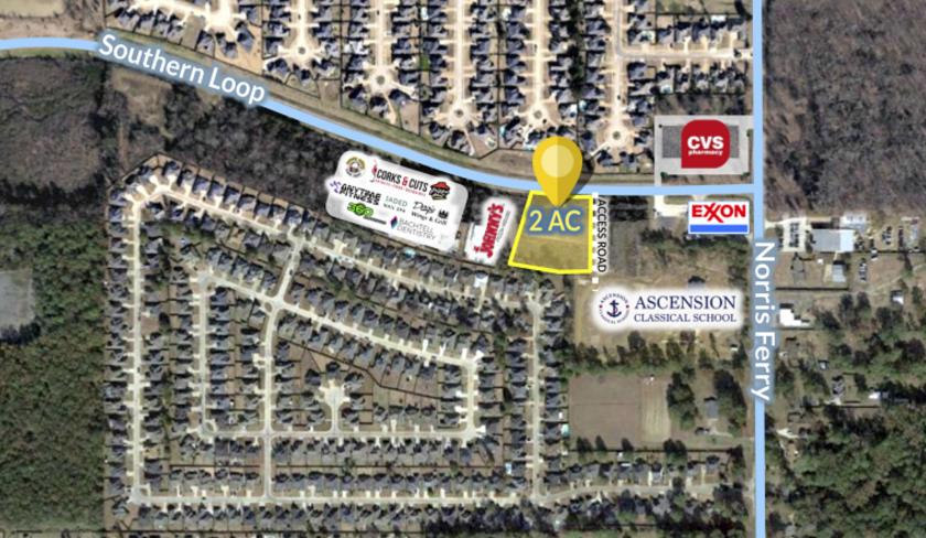 Located at a growing intersection with excellent visibility, this property is a great development opportunity. The acreage is located on Southern Loop just west of Norris Ferry across the street from the CVS and beside the Johnny's Pizza that will be coming soon. There are approximately two acres that offer 300' of frontage on Southern Loop. The acreage can be subdivided as well as sold separately.