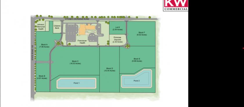 Prime location in Johnson County's most explosive growth neighborhood. Already home to Franciscan Health 100,000 sf medical complex and Citizen's Bank, this site provides multiple outlots with frontage to State Rd. 135 and Stones Crossing, a major connector road to U S 31 and I 65 (East) and soon to be I 69 (West). C 2 zoning allows for multiple use categories with lots from 2.35 acres up to the entire parcel of 60+ acres. Outlots and acreage for sale. Seller will consider ground leases. Two liquor licenses are available: one type 210 3 way and one type 115 grocery license