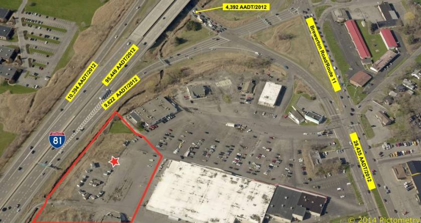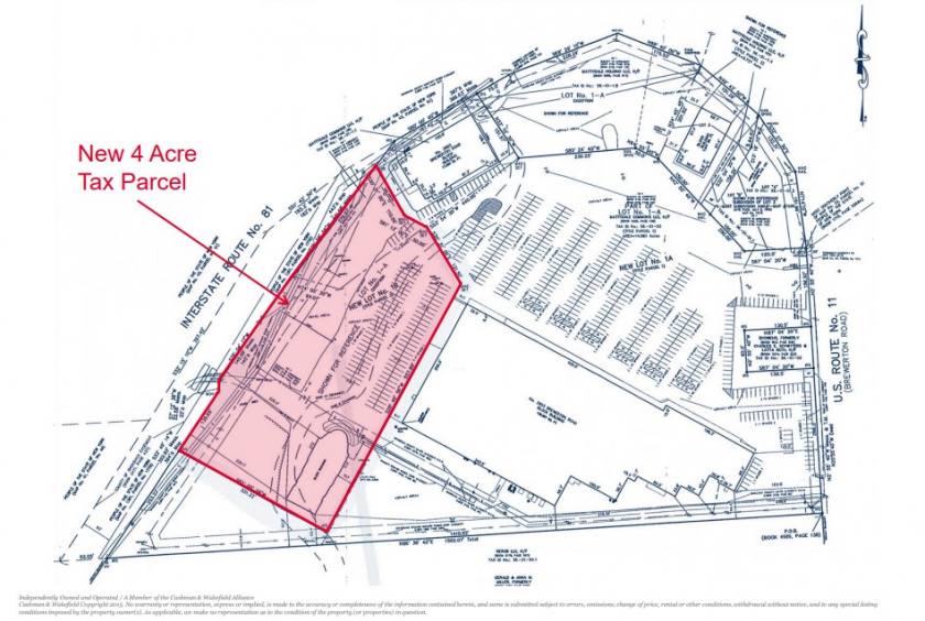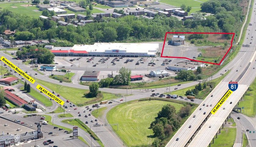 1 to 4 acre retail development site. Most visible site in CNY right off exit on Rt 81, perfect for Hotel, Retail, or Restaurant. Over 110,000 cars daily. Halfway between the Airport and Carousel Mall. Community Shopping Center anchored by K-Mart, Dollar Tree, Rent-A-Center, Gertrude and Hawk and others. Plaza has great central location in Syracuse Trade Area and features convenient access to I-81 interchange. Owner has made facade and parking lot improvements in 2008. 1 to 4 acres available for Hotel or Retail site. Land lease or BTS. $50,000 per acre per year to lease. $400,000 per acre to buy. It has been subdivided and now has separate tax parcel.